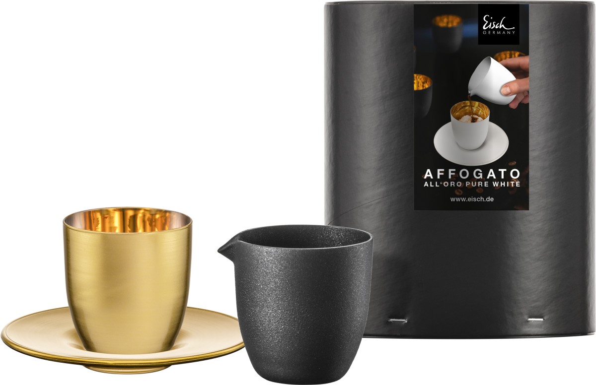 - 1 EISCH Affogato-Set COSMO Collect full- gold enthält ein Espressoglas mit Untertasse und Kännchen, veredelt mit Echtgold und im schwarzen Stein-Look. Das Set ist in einer attraktiven Geschenk-Röhre verpackt.
