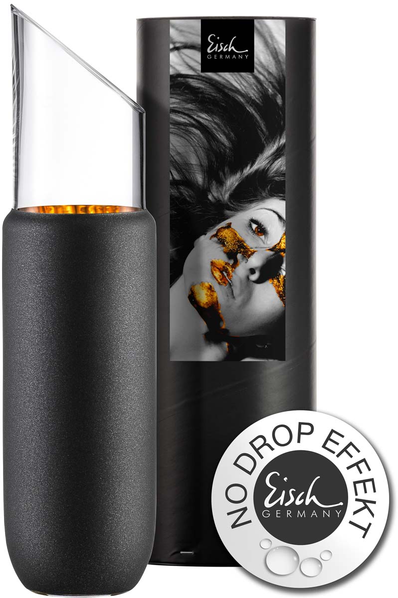 - 1 handgefertigte EISCH Karaffe COSMO gold vielseitig verwendbar für Wasser, Wein, Saft, etc. - im schwarzen Stein-Look mit Echtgold-Veredelung. Diemundgeblasene Karaffe ist in einer schwarzen Geschenkröhre verpackt.