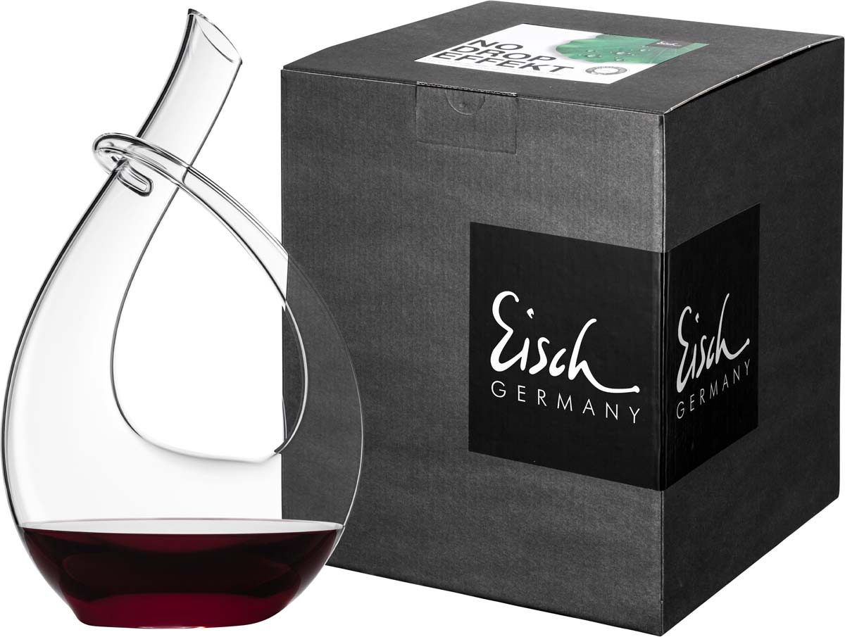- 1 EISCH Dekantierkaraffe EMBRACE aus mundgeblasenem Kristallglas ist im schwarzen Geschenk-Karton verpackt.