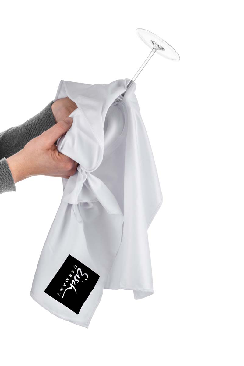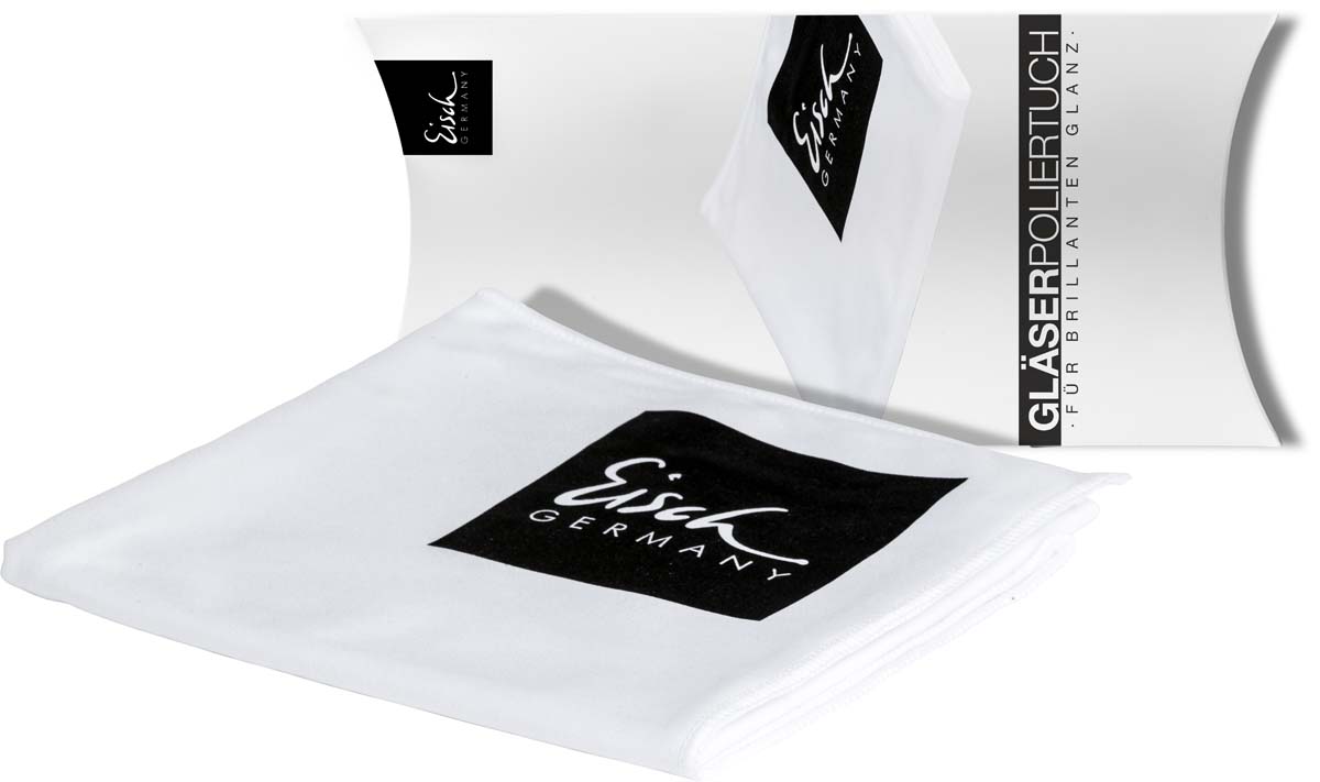 - 1 weißes GLÄSERPOLIERTUCH mit EISCH-Logo ist in einem bedruckten Geschenkkarton verpackt. Eine perfekte Geschenkidee für jeden, der auf brillant glänzendes Glas Wert legt!