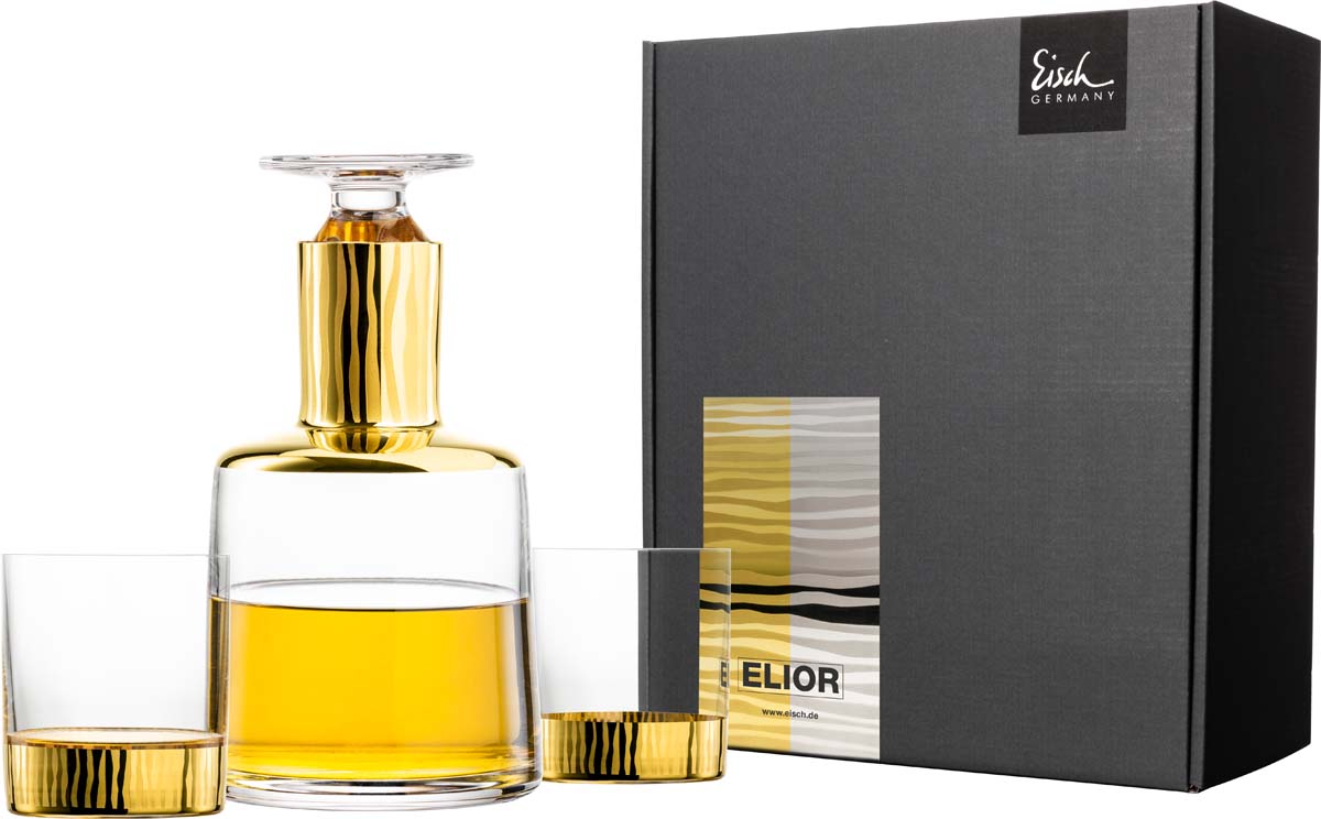 • 1 EISCH Whiskykaraffe ELIOR gold ist zusammen mit 2 Whisky-Bechern ELIOR gold im schwarzen Geschenkkarton verpackt.