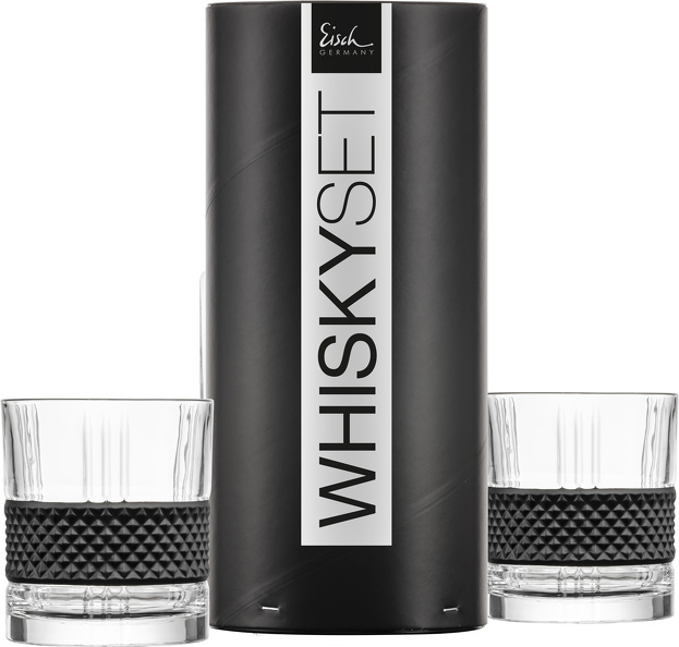 • 2 EISCH Whiskygläser GLEN mit matt-schwarz veredelter, grafischer Struktur sind in einer Geschenkröhre verpackt. Nutzen Sie den Becher auch als Wasserglas, Cocktailglas, für Säfte und viele andere Getränke.