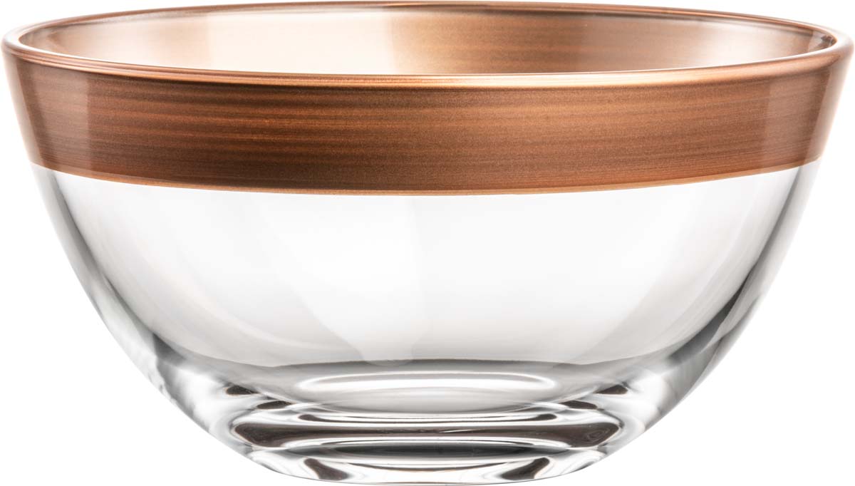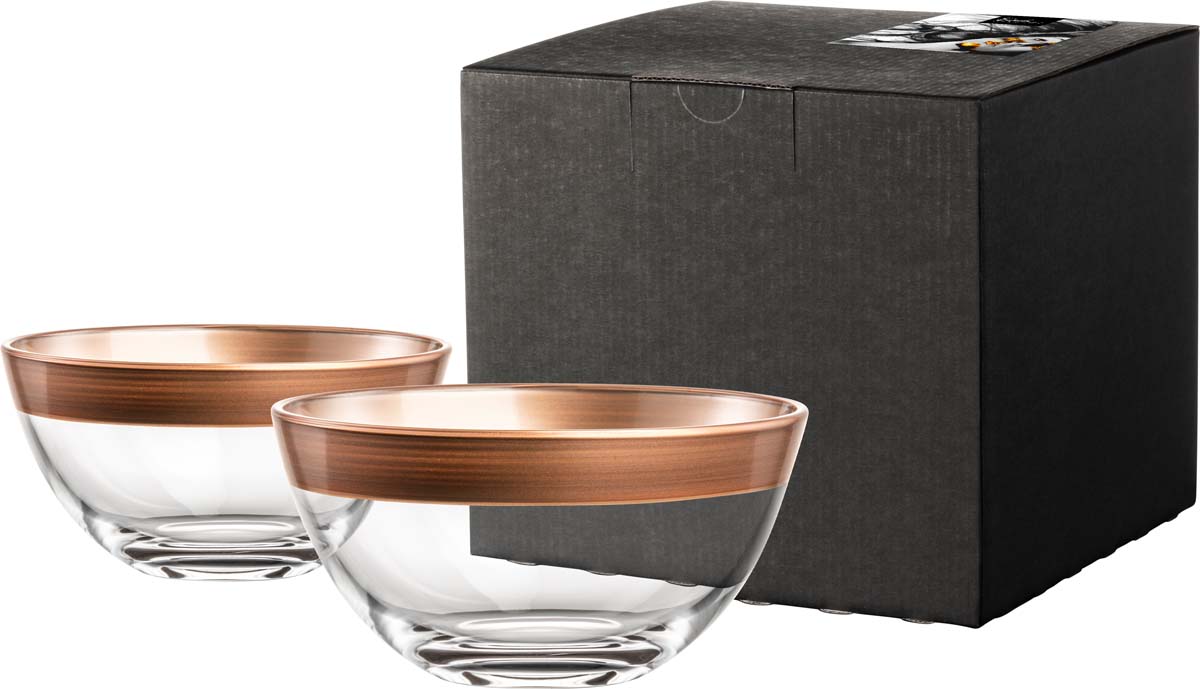 • 2 EISCH Schalen KAYA kupfer Ø 14cm aus hochwertigem Kristallglas, in Handarbeit in Kupfer veredelt. 2 Schalen sind im schwarzen Karton verpackt.