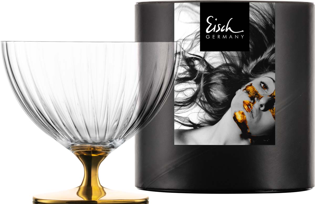 • Aus brillantem Kristallglas gefertigt mit fein gerippter Struktur. Fuß und Bodenplatte der Schale sind in Handarbeit mit Gold beschichtet, das durch die EISCH GPC-Protect© -Technik dauerhaft geschützt wird. Handwäsche.