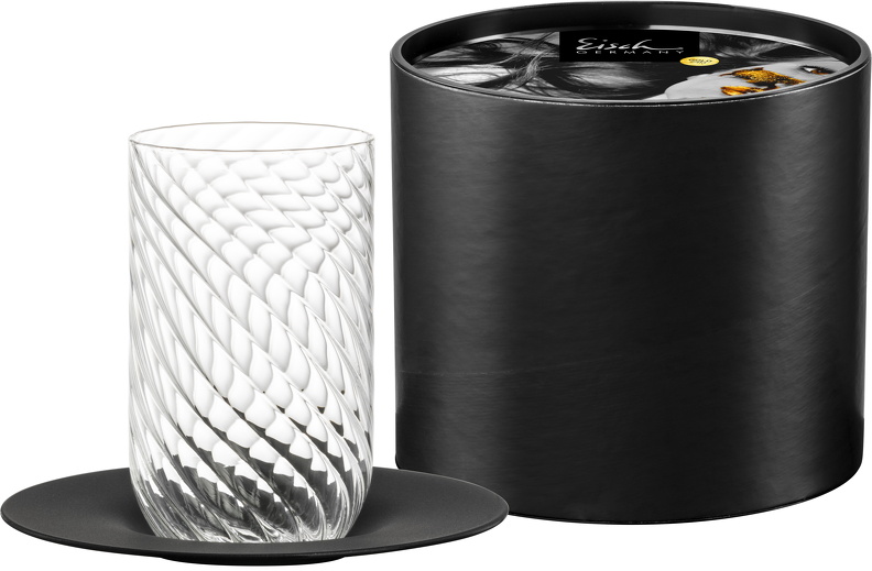 • 1 EISCH Latte Macchiato Glas TWIST black mit fein geschwungener Linienstruktur ist mit einer schwarzen Untertasse in einer attraktiven Geschenk-Röhre verpackt.