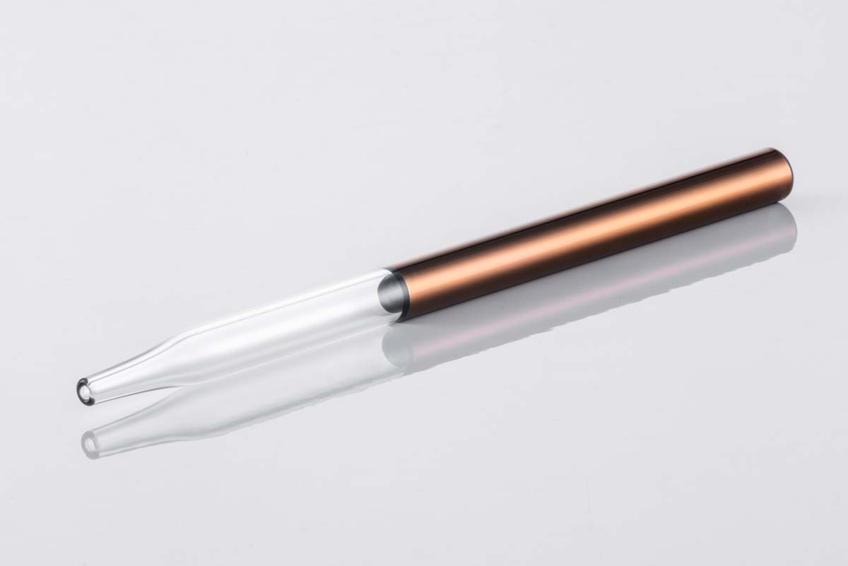 - Die Pipette wird in Deutschland aus besonders stabilem Spezialglas hergestellt und in Handarbeit mit Kupfer veredelt. Die Länge beträgt 165mm bei einem Durchmesser von 10mm.