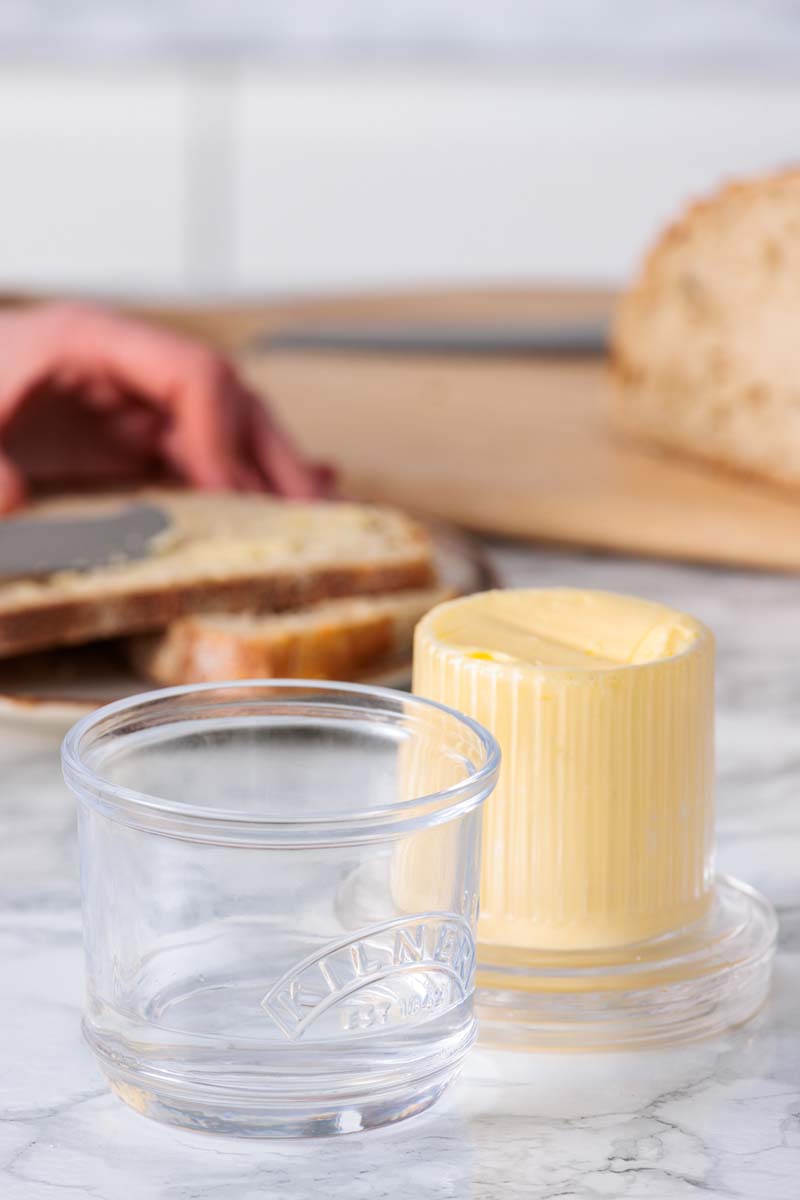 Gefertigt aus hochwertigem Glas überzeugt das Butterfass nicht nur funktional, sondern auch optisch: Das prägante Kilner-Logo auf dem strukturierten Glas unterstreicht den authentischen, zeitlosen Charakter.