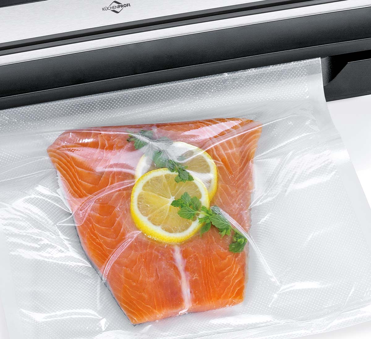 Die Vakuumbeutel haben eine Breite von 28 cm und eine Länge von 5 m, lassen sich beliebig zuschneiden und sind ideal auf den Vakuumierer IMPULS abgestimmt. So können Sie Lebensmittel sicher aufbewahren, länger frisch halten und geschmackvoll zubereiten.