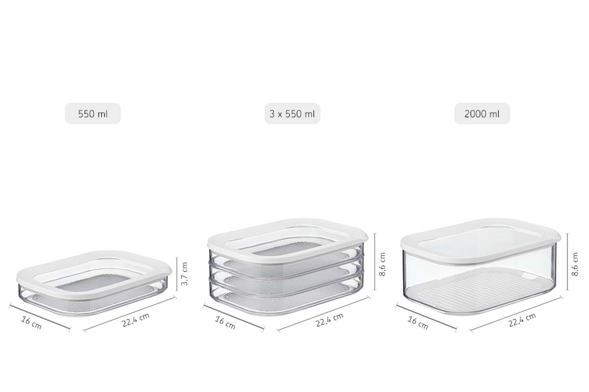 Die Modula ist ein Musterbeispiel für funktionales Design: Denn durch den transparenten Deckel sieht man auf einen Blick wie viel Käse man noch auf Vorrat hat. Die Größen der Modula Aufbewahrungsdosen mit dem herausnehmbaren Kondeseinsatz sind abgestimmt auf die Verkaufsverpackungen der gängigen Käsesorten und bleiben durch den Dichtungsring im Deckel länger haltbar. Ob für Familien- oder Single- Haushalte, kleine oder große Küchen: die Modula sorgt mit ihren abgerundeten Ecken immer für Ordnung und Überblick in dem Kühlschrank.