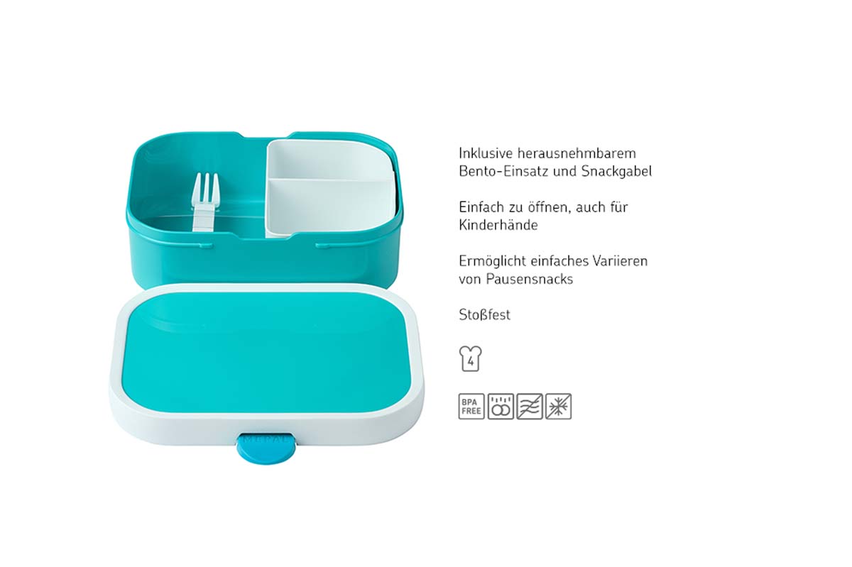 Jetzt gibt es Abwechslung beim Pausensnack! Der herasunehmbare Bento-Einsatz unterteilt die Brotdose in einzelne Fächer. Lieber ein klassisches Pausenbrot? Ohne Bento-Einsatz bietet die Dose Platz für 4 Butterbrote. Brotdose und Bento-Einsatz lassen sich nach Gebrauch ganz einfach in der Spülmaschine reinigen.