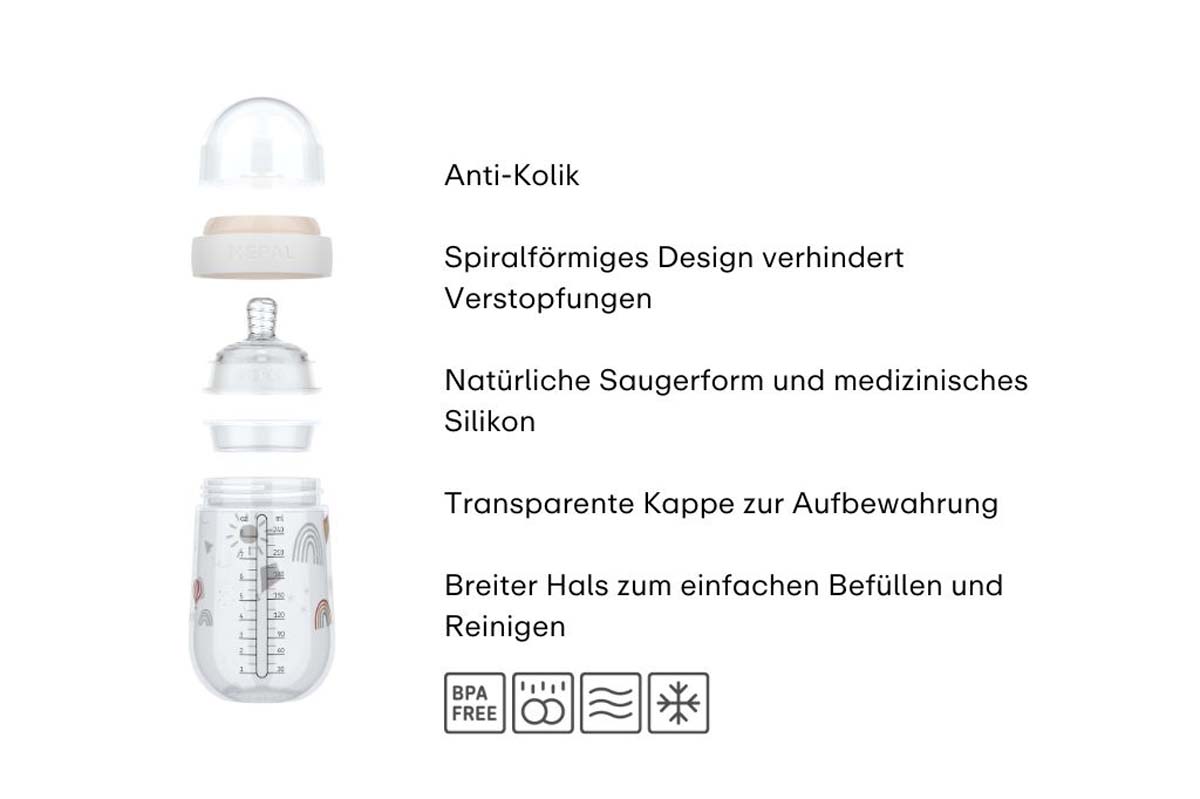 Das clevere Anti-Kolik-System mit spiralförmigen Design sorgt für einen konstanten Durchfluss ohne Luftblasen. So kann Ihr Baby trinken und es minimiert das Risiko von Magenkrämpfen. Dank des weiten Halses ist die Flasche leicht zu befüllen und einfach zu reinigen, wodurch eine optimale Hygiene bei jedem Gebrauch gesichert ist. Der transparente Verschluss schließt die Flasche auslaufsicher ab, sodass sie sicher in der Tasche transportiert und vor dem Gebrauch einfach geschüttelt werden kann. Mit der Mepal Mio Babyflasche fühlt sich jeder Trinkmoment vertraut an.