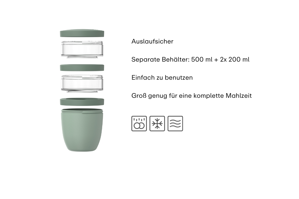 Alle Behälter sind auslaufsicher und können somit bequem in jeder Tasche transportiert werden. Nach Gebrauch lassen sich alle Einzelteile in der Spülmaschine reinigen und sind danach wieder bereit für den nächsten Verpflegungs-Einsatz. Die einzelnen Deckel passen übrigens auf beide Behälter, so muss man morgens nicht den passenden Deckel suchen... Der Inhalt der beiden oberen, transparenten Behältern beträgt 200 ml, d.h. dort ist Platz für ca. 75 g Müsli oder Obst. Das Volumen bzw. der Inhalt des unteren Behälters bietet mit 500 ml genug Platz für eine Portion Suppe, Nudeln oder Joghurt.