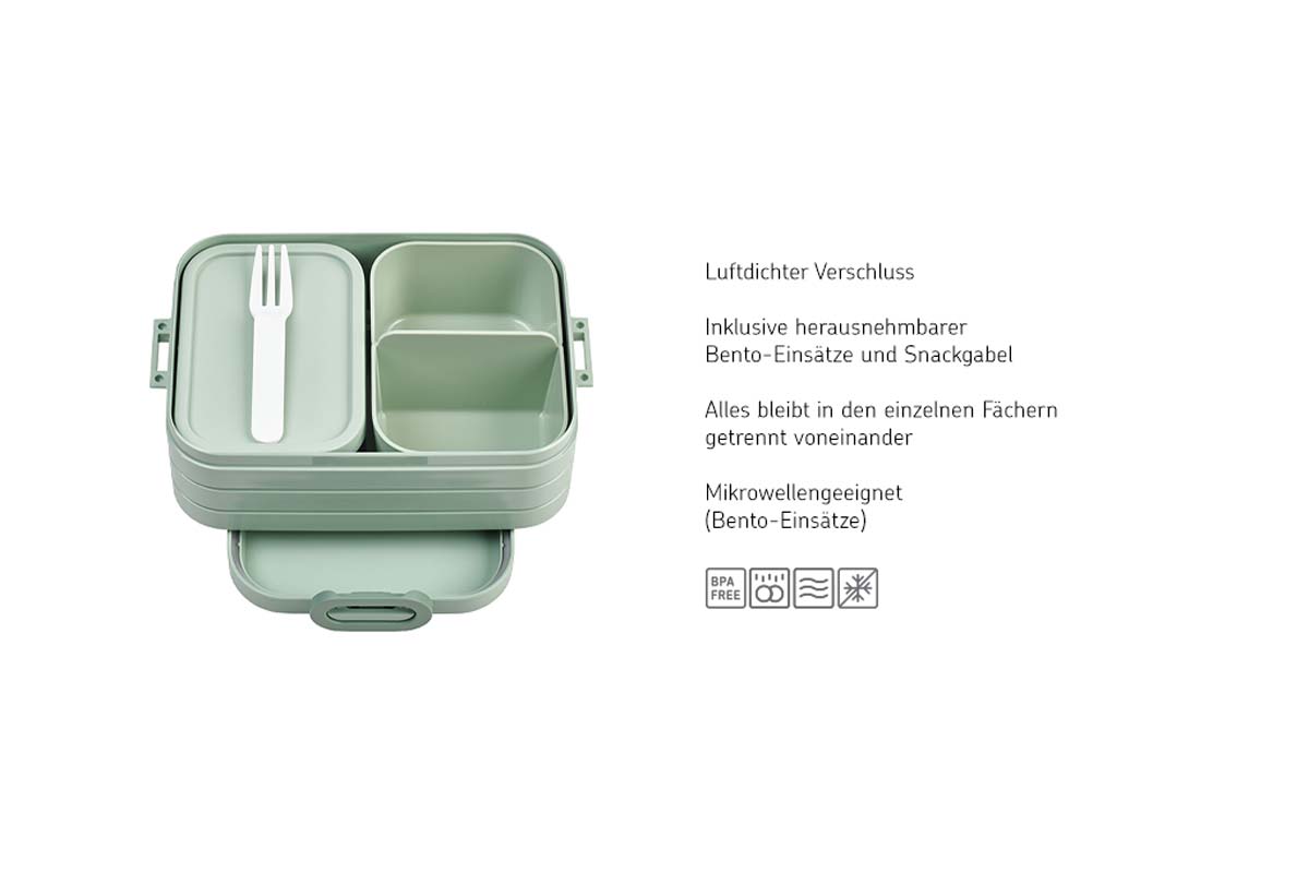 Noch Reste vom Vortag übrig? Diese lassen sich jetzt ganz einfach für mitnehmen. Die Bento-Einsätze sind herausnehmbar. Perfekt, um verschiedene kleine Gerichte miteinander zu kombinieren. Neben dem Bento-Einsatz mit den Fächern hat Mepal auch einen Behälter mit Deckel und Gabel hinzugefügt. Die Einsätze können in der Mikrowelleverwendet werden und sind abnehmbar, ohne die Einsätze bietet die Lunchbox Platz für vier oder acht Butterbrote. Der Deckel mit dem Dichtungsring und fest schließenden Clips hält Speisen schön frsich.