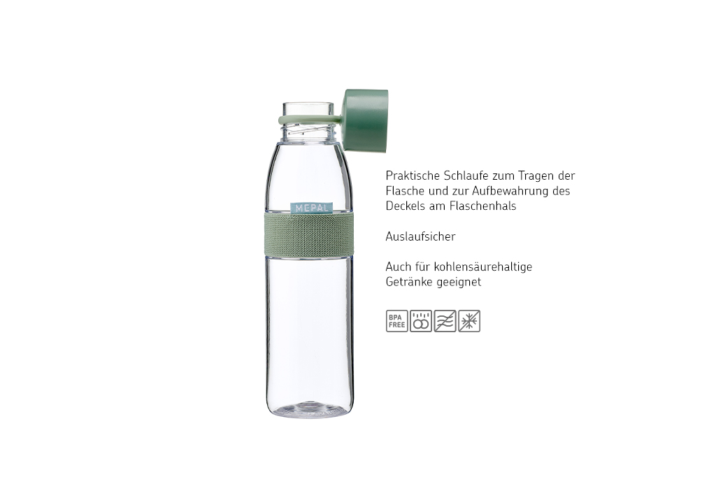 Gesund, umweltfreundlich und vorteilhaft: Das ist diese nachfüllbare Wasserflasche von Mepal. Praktisch bei der Arbeit, beim Sport oder während der Freizeit. Der leicht zu öffnende Deckel hat eine kleine Schlaufe, an der sich die Flasche auch ganz einfach tragen lässt. Die Trinkflasche Ellipse ist BPA-frei, kann (ohne Gummiband) im Geschirrspüler gereinigt werden und ist 100% dicht! Die Wasserflasche Ellipse ist auch für die Verwendung von kohlensäurehaltigen Getränken geeignet (Tipp: Fülle die Flasche nie randvoll). Nach dem Reinigen sollte die Flasche offen aufbewahrt werden. Der Deckel kann dabei mit seiner Silikonschlaufe am Flaschenhals befestigt werden und kommt so nicht weg - auch daran haben wir gedacht!