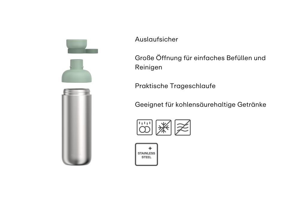 Füllen Sie einfach Ihre Mepal Vita Edelstahl-Wasserflasche, stecken Sie sie in ihre Tasche und los geht’s! Die auslaufsichere Flasche hat zwei Öffnungen: eine zum einfachen Trinken und eine größere zum einfachen Reinigen oder um Ihr Wasser mit Früchten oder Kräutern zu verfeinern. Mit praktischem Tragegriff und sie hält dein Wasser auf der richtigen Temperatur. Wiederbefüllbar und mehrfach nutzbar - die perfekte Alternative zu Einweg-Plastikflaschen.