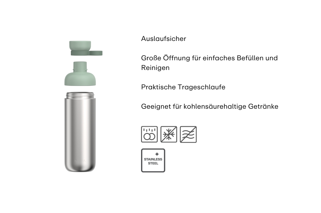 • Geeignet für kohlensäurehaltige Getränke (Nicht ganz auffüllen und nicht schütteln)