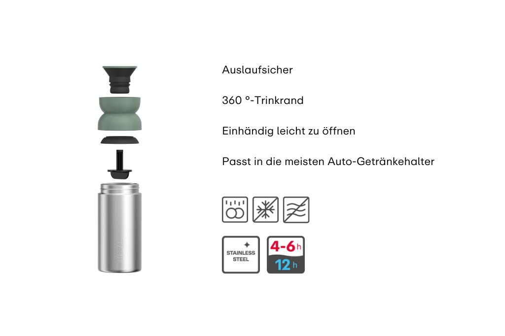 Bleiben Sie erfrischt, egal wohin der Tag Sie führt. Zum Trinken drücken, zum Verschließen drücken - und kein Verschütten. Der 360°-Rand ermöglicht das Trinken von jeder Seite, perfekt für hektische Morgen, Roadtrips oder den Weg zur Arbeit. Die doppelwandige Vakuumisolierung hält Kaffee bis zu 4 Stunden heiß oder Getränke bis zu 12 Stunden kalt, während die 350-ml-Größe in die meisten Auto-Getränkehalter passt. Hergestellt aus 90 % recyceltem Edelstahl für Langlebigkeit und Nachhaltigkeit.