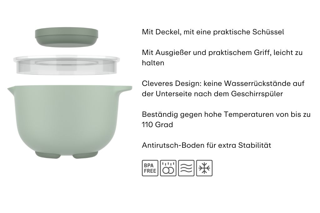Dank dem rutschfesten Boden bleibt die Schüssel auch bei kräftigem Mixen mit dem Mixer fest stehen. Der komfortable Griff liegt gut in der Hand, damit Sie mühelos Ihren Lieblingsteig mischen und verrühren können.