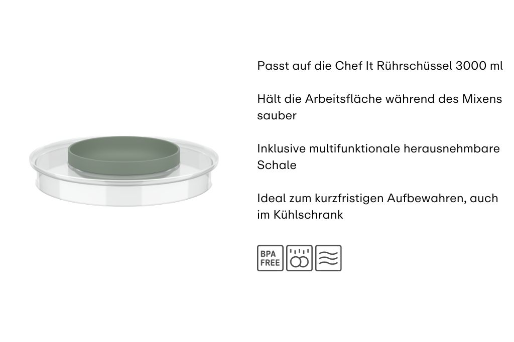 Der Spritzschutzdeckel der 3-Liter-Schüssel sorgt dafür, dass alles, was Sie verrühren, auch in der Schüssel bleibt. Mit der kleinen Schale verschließen Sie den Deckel der Rührschüssel. Perfekt, um den Inhalt kurz im Kühlschrank aufzubewahren. Verwenden Sie die Schale auch zum Ablegen des Teigschabers oder um Zutaten aufzubewahren, die Sie später hinzufügen. Hergestellt aus hochwertigem Material, das Temperaturen bis zu 110°C standhält - ideal für die Mikrowelle.