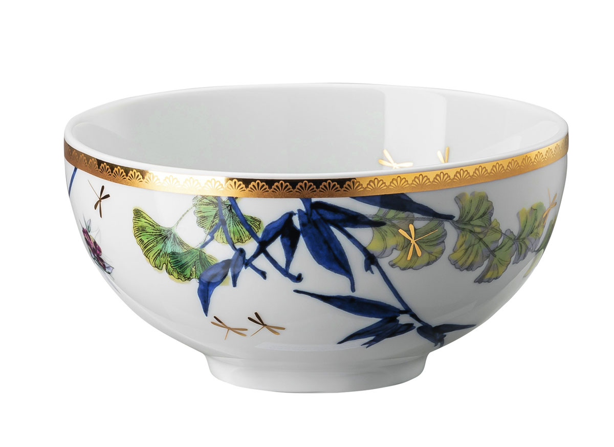 Bei der Serie "Turandot" greifen westliche und östliche Elemente ineinander. Bambus und Gingkoglätter treffen auf goldene Libellen. Ein üppiger Goldrand rundet alle Teile gekonnt ab. Porzellan, spülmaschinenfest, durch Goldrand nicht mikrowellengeegnet