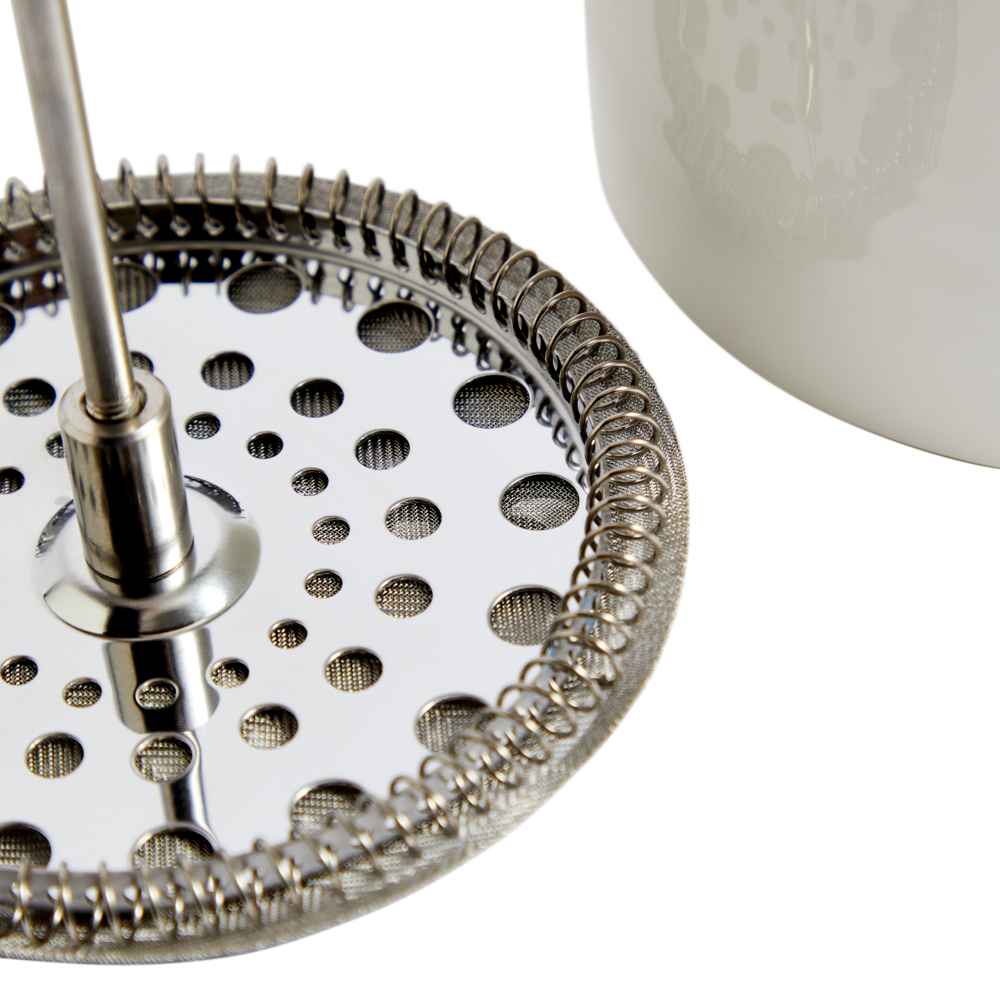 Bitte beachten Sie die Pflege- und Zubereitungsanweisungen, damit Sie einen guten Kaffee genießen können. Beim Öffnen der French Press ist es wichtig, dass Sie das Sieb vor dem Einsetzen in den Keramikkörper leicht am Umfang nach unten drücken. Dadurch wird verhindert, dass die Presse beim Einsetzen herunterfällt, und Sie können jedes Mal den besten Kaffee genießen.